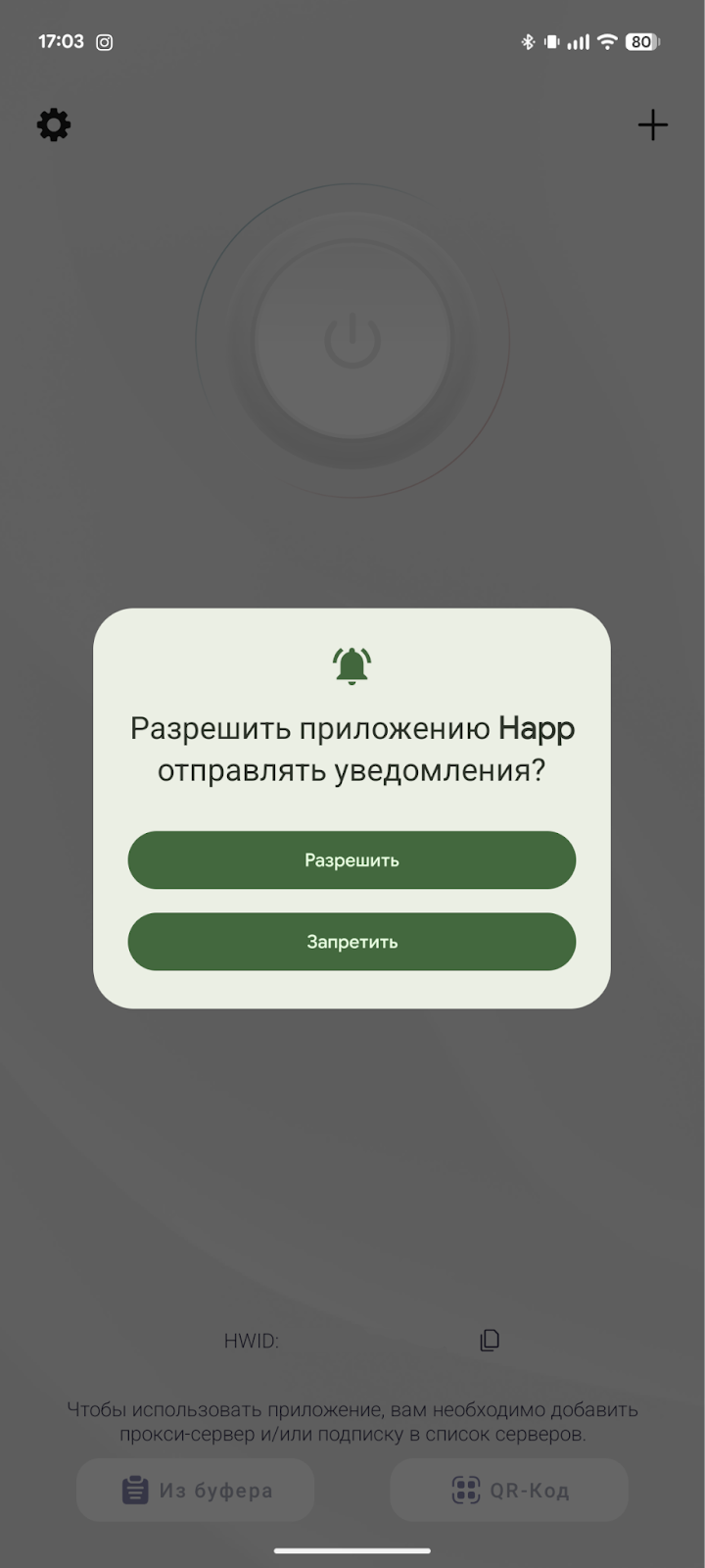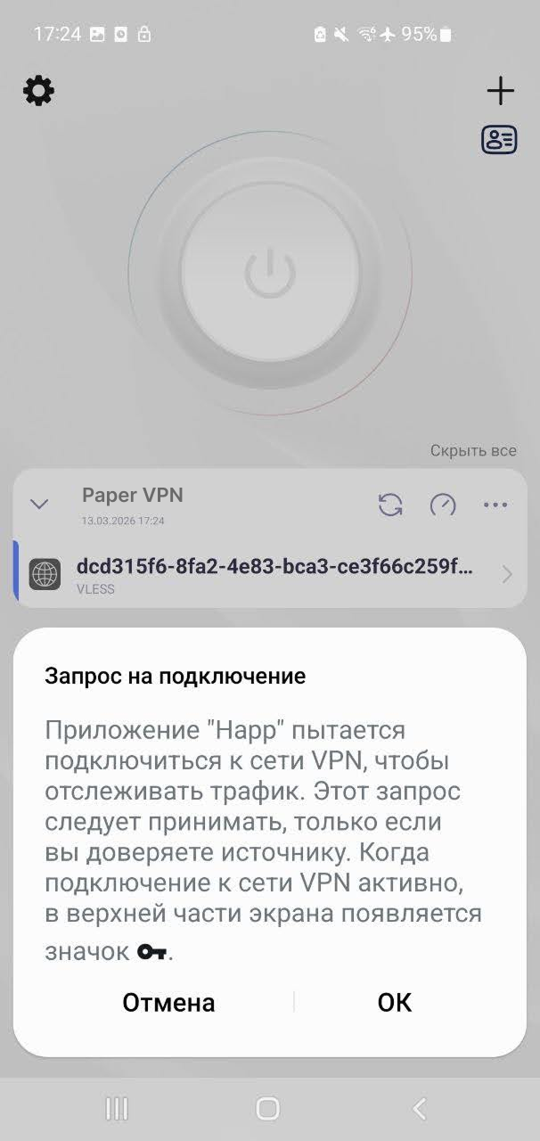 Перед первым подключением приложение попросит разрешить доступ на добавление конфигурации. Нажми «Разрешить».
