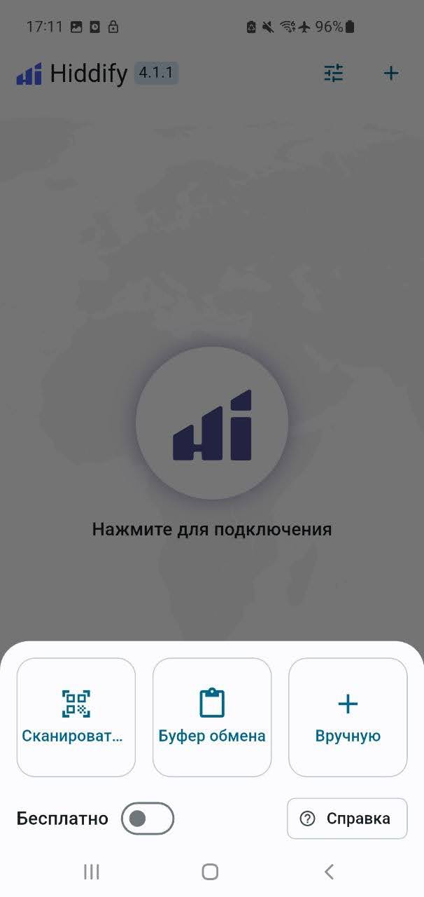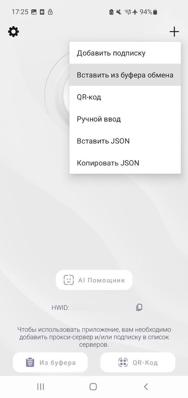 Открой приложение Happ и нажми на значок «+» в правом верхнем углу. Выбери «Вставить из буфера обмена». Другой вариант — нажать на кнопку «Из буфера» внизу слева.