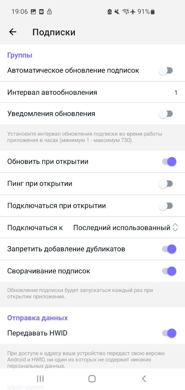 Открой приложение Happ и нажми на иконку шестеренки в левом верхнем углу. Откроются «Настройки». Выбери там «Подписки».