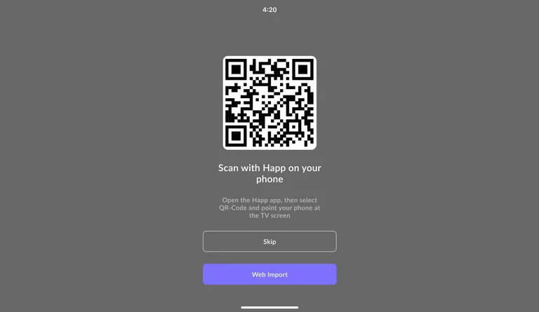 •Откройте приложение Happ на телевизоре Там вы увидите QR-код — он появляется при первом запуске. Отсканируйте QR-код с помощью приложения Happ на смартфоне. Это нужно, чтобы ваша подписка добавилась в приложение Happ на телевизоре