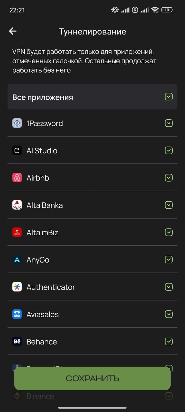4. Отметьте галочкой приложения, для которых должен работать VPN. Нажмите «Сохранить».